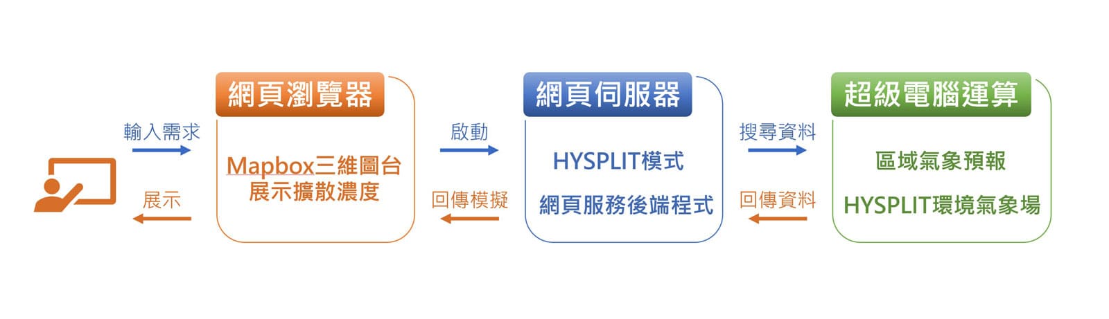 網頁包含三個主要部分:超級電腦運算端、網頁伺服器端和網頁瀏覽器端。超級電腦會每天自動下載最新的全球天氣資料,並進行高解析度模擬計算。使用者在網站上輸入災害時間、地點、高度、污染物質和排放源面積後,系統會立即計算出未來36小時內的污染物濃度分布,並在三維地形圖臺上展示。
