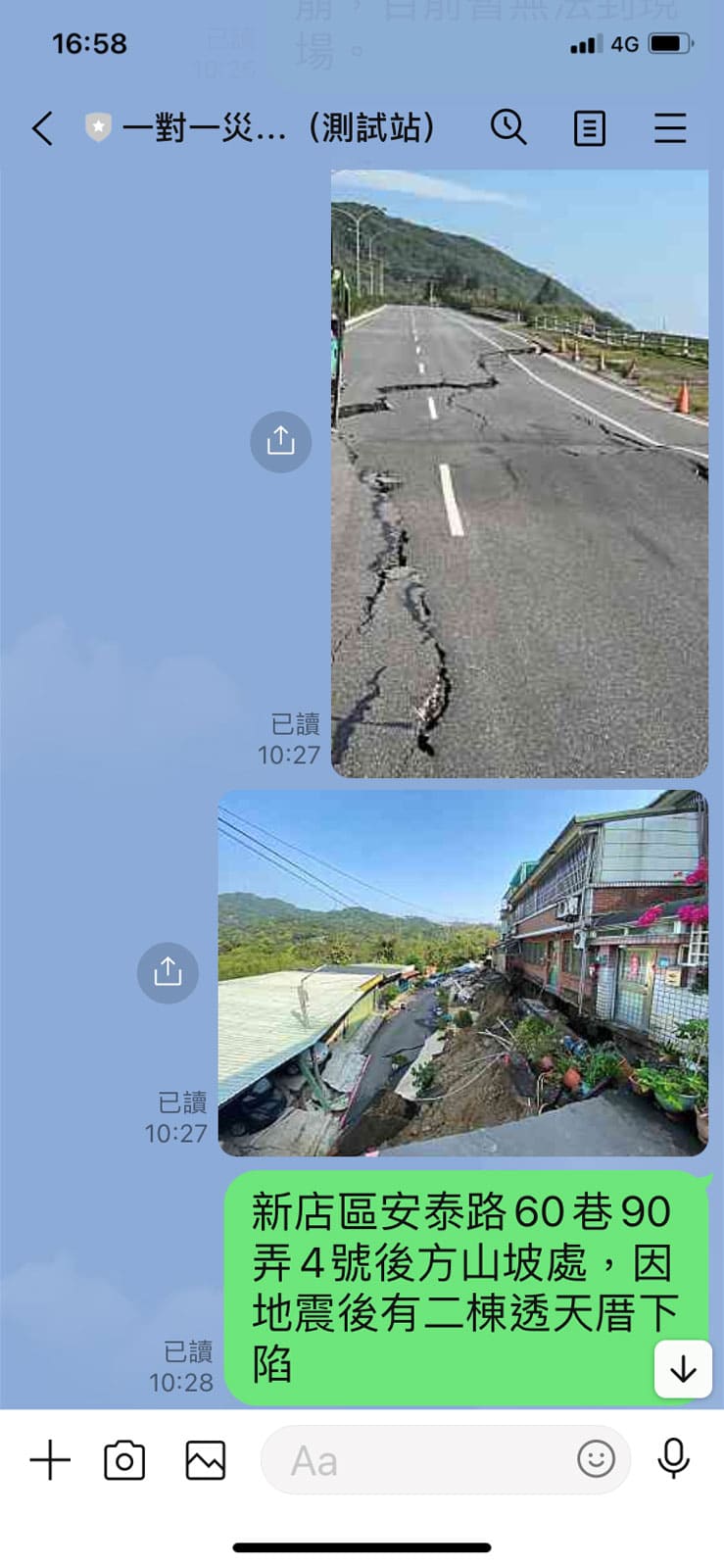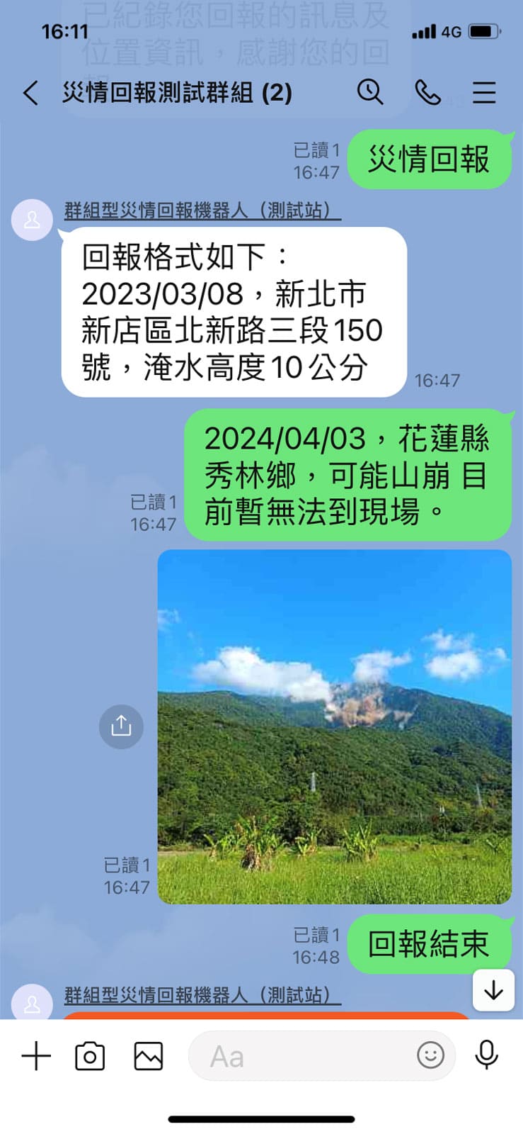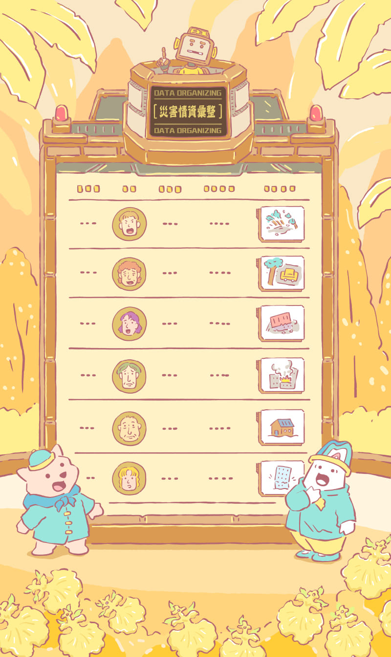 透過台灣熱門的社群軟體LINE,建置防災用的對話機器人,支援全台各地進行災情回報,作為一種災情提供管道,具備快速、自動化且簡易的傳遞模式。