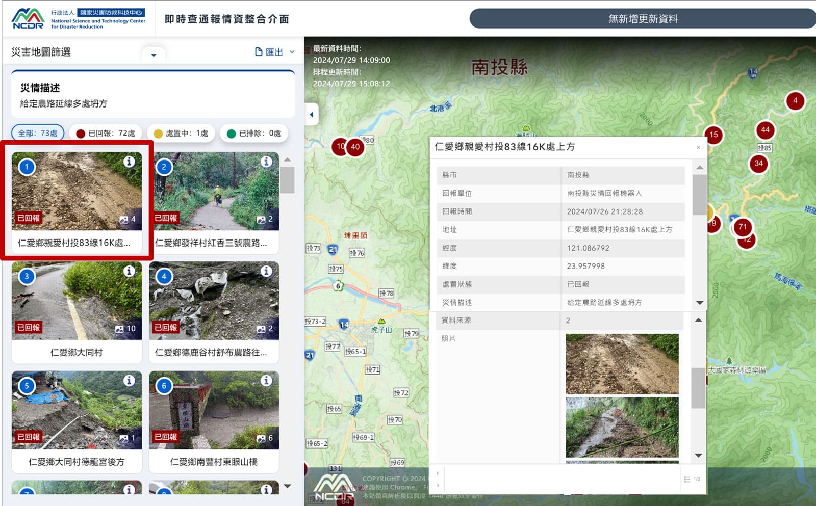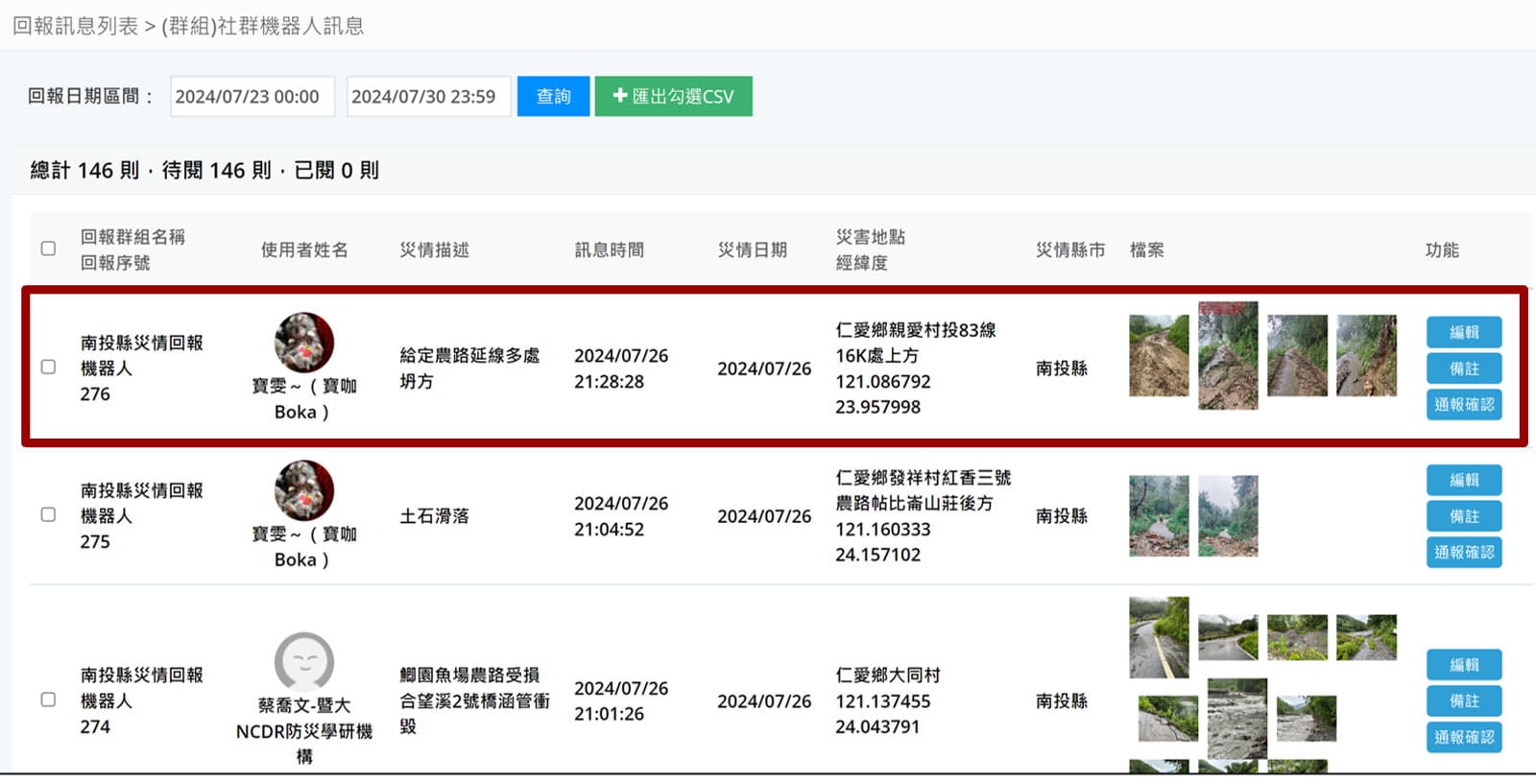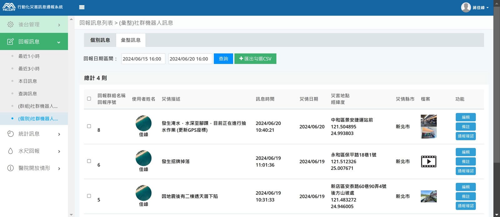 憑藉AI模型協助分析災情通報資訊,結構化拆解描述內容並自動化執行蒐整任務,管理者可於後台檢核資料並修正,確保其資料完整性與正確性。